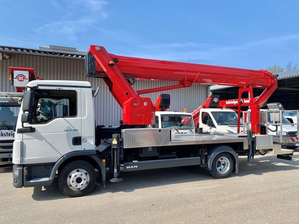 Mit dem Ruthmannsteiger TB270 setzen wir ab sofort das leistungsfähigste Gerät seiner Klasse ein. Die Lkw-Hubarbeitsbühne mit einem Gesamtgewicht von 3,5 t erreicht eine Arbeitshöhe von 27 Meter. Die Reichweite beträgt bis zu 14,8 m und bis zu einer maximalen Arbeitskorblast von 230 kg, was einer Mehrleistung von 30 Kilogramm gegenüber herkömmlichen Modellen entspricht. Das Fahrzeug verfügt über eine schmale Durchfahrbreite von ≥ 2,1 m und eine niedrige Durchfahrhöhe von ≥ 3,0 m, die eine hohe Flexibilität bei den Einsatzorten ermöglicht. Für dieses Fahrzeug reicht die Führerscheinklasse B oder 3.