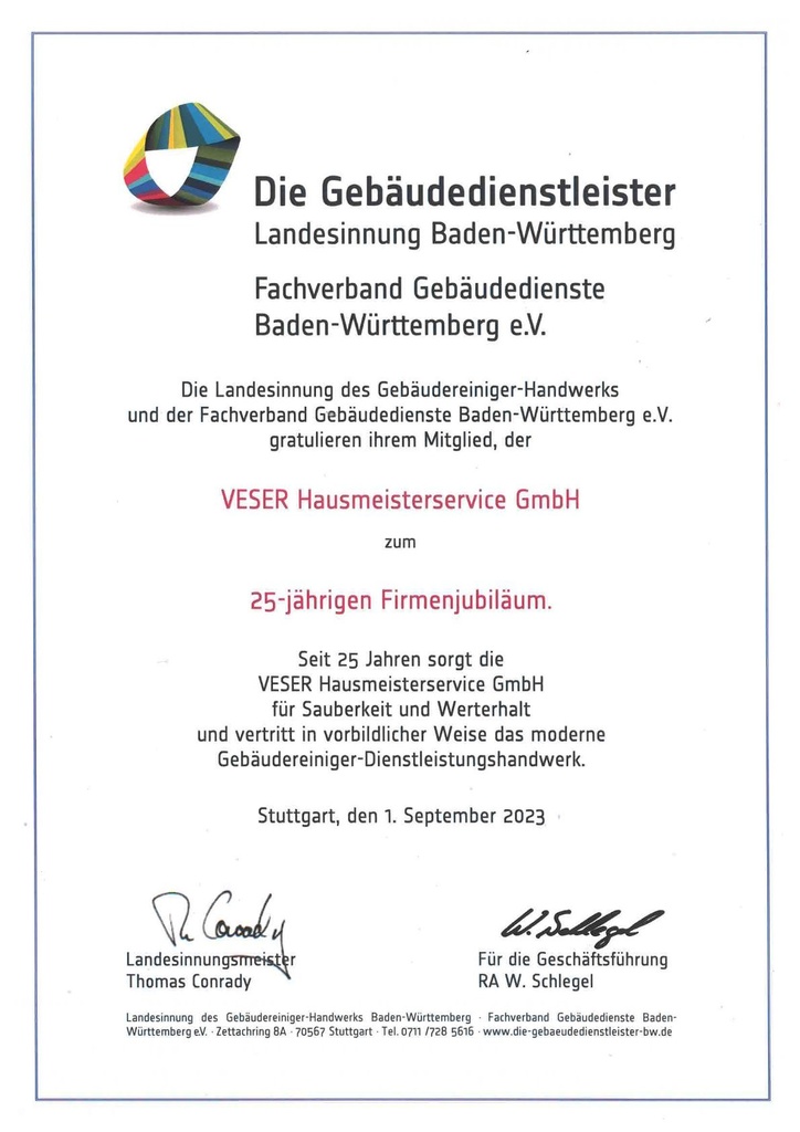Wir wurden von der Landesinnung und vom Fachverband des Gebäudereiniger-Handwerks Baden-Württemberg zum 25-jährigen Firmenjubiläum beglückwünscht und geehrt.