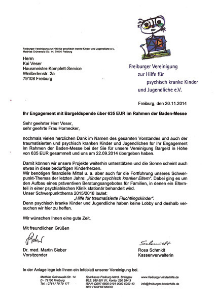 Wir freuen uns sehr, dass wir im Laufe der Baden Messe in Freiburg durch unsere Hubsteiger-Fahrten für die Freiburger Vereinigung zur Hilfe für psychisch kranke Kinder und Jugendliche e. V. insgesamt 635 Euro sammeln konnten und hoffen dass wir damit den betroffenen Kindern und Jugendlichen eine Freude bereiten können.